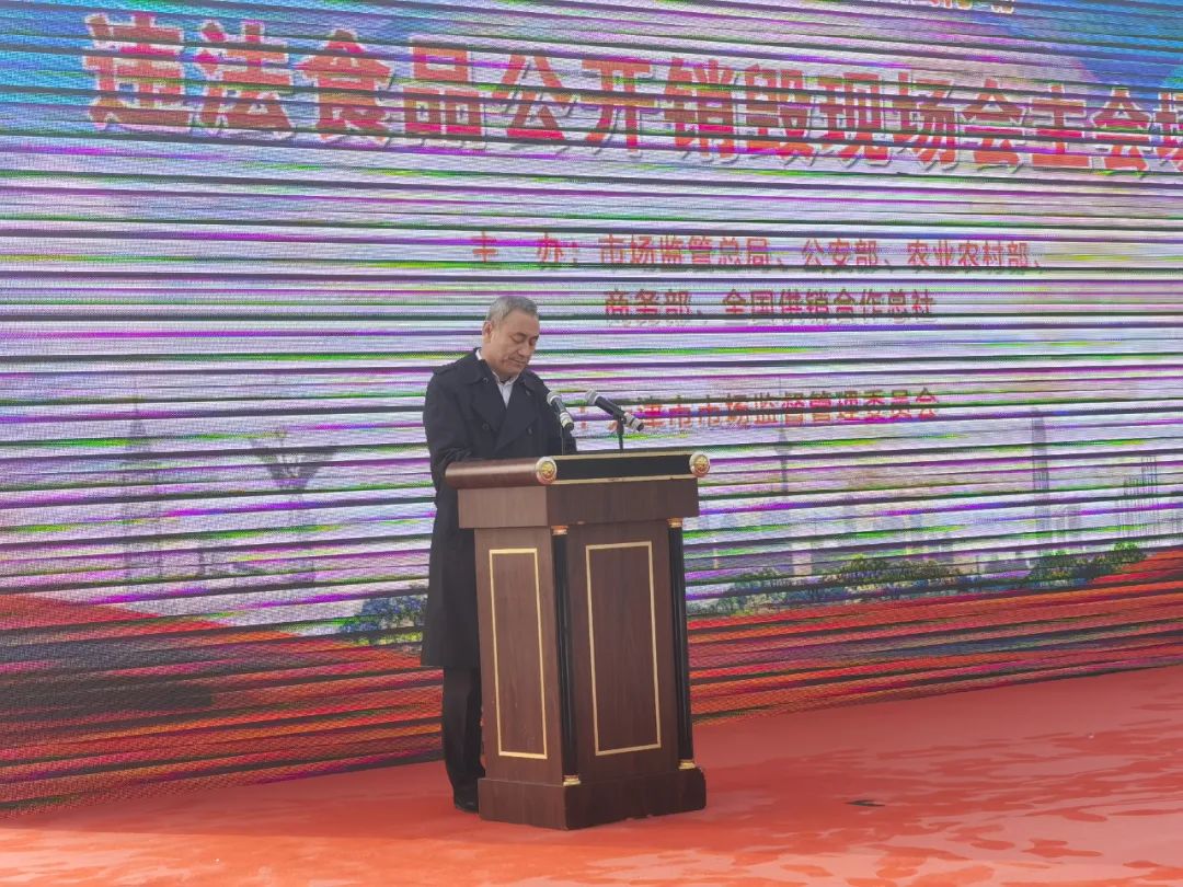 今日,由國家市場監(jiān)管總局、公安部、農(nóng)業(yè)農(nóng)村部、商務(wù)部、中華全國供銷合作總社五部門聯(lián)合主辦的“農(nóng)村假冒偽劣食品專項(xiàng)執(zhí)法行動(dòng)違法食品公開銷毀現(xiàn)場會(huì)”以視頻連線方式在北京召開,天津食品集團(tuán)作為唯一一家企業(yè)代表受邀參加天津主會(huì)場會(huì)議,集團(tuán)黨委副書記、總經(jīng)理趙國榮出席并代表集團(tuán)發(fā)言。