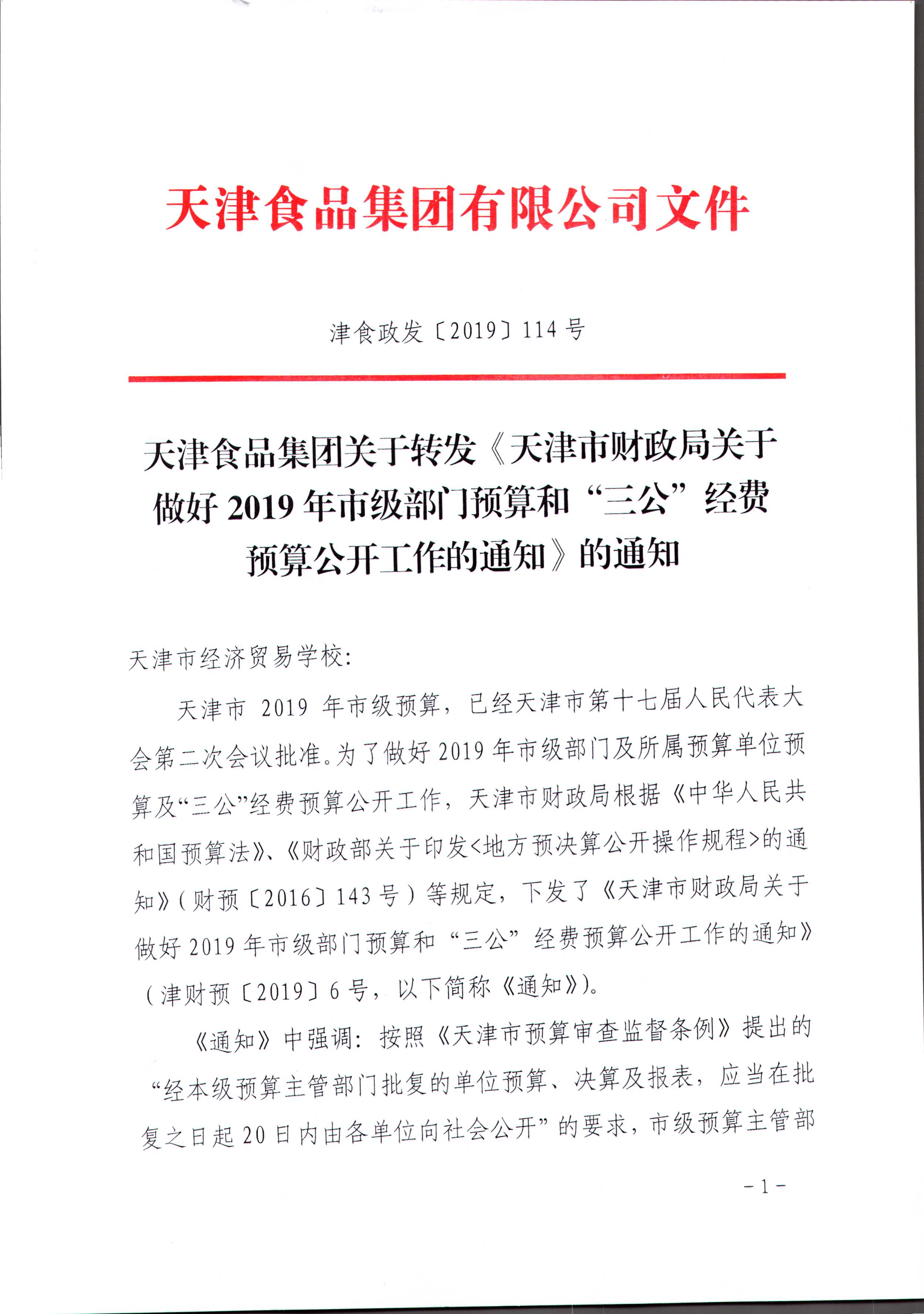 天津食品集團(tuán)關(guān)于轉(zhuǎn)發(fā)《天津市財(cái)政局關(guān)于做好2019年市級(jí)部門預(yù)算和“三公”經(jīng)費(fèi)預(yù)算公開(kāi)工作的通